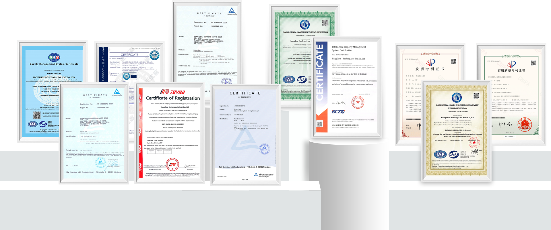 Wspierane przez Hangzhou Benfeng — twórcę normy przemysłowej JB/T13693-2019 dotyczącej foteli kierowców pojazdów przemysłowych, a także przedsiębiorstwo high-tech w prowincji Zhejiang oraz przedsiębiorstwo „specjalistyczne, wyrafinowane, wyróżniające się, innowacyjne” — akcesoria do siedzeń są produkowane w znormalizowanej bazie 14 000㎡, a jakość spełnia rygorystyczne wymagania renomowanych partnerów, takich jak Hangcha i Jungheinrich. Uzyskali cztery główne certyfikaty ISO i międzynarodowy certyfikat CE; niektóre są nawet zgodne z normami europejskimi, w tym EN13490 (IT1, IT2) i ISO7096 (EM1, EM7). Łącząc wiele patentów krajowych, akcesoria te zapewniają bezpieczne i niezawodne wsparcie dla siedzeń maszyn terenowych.