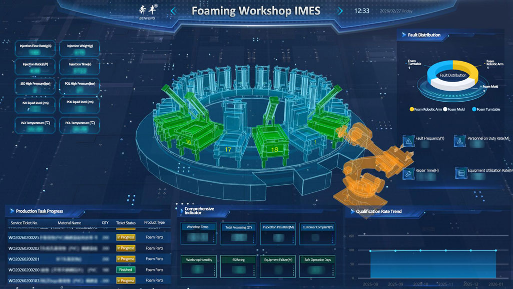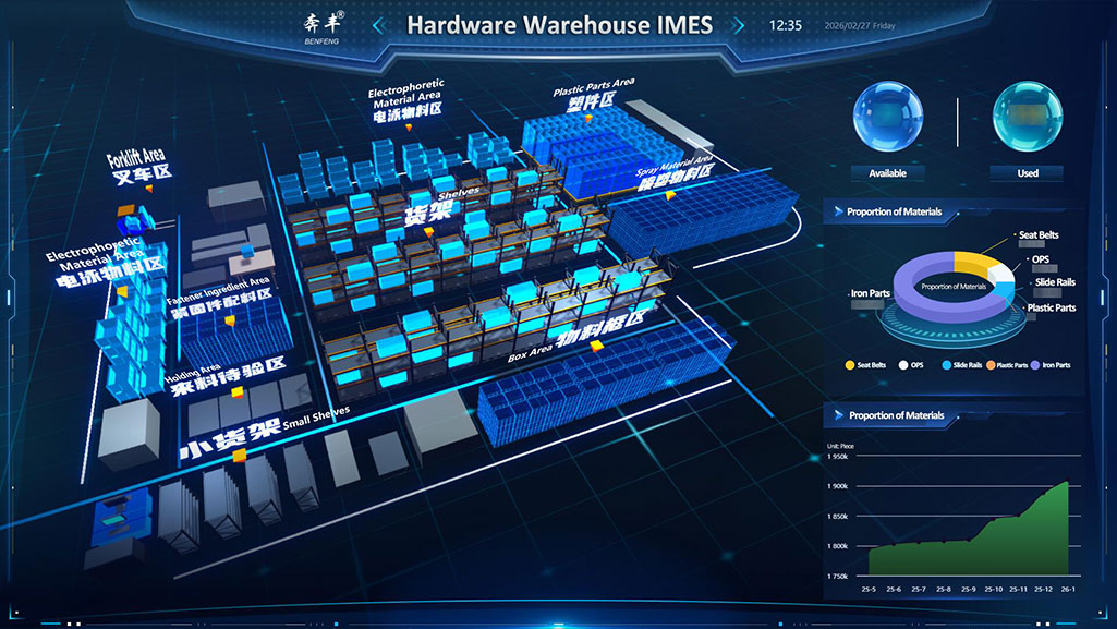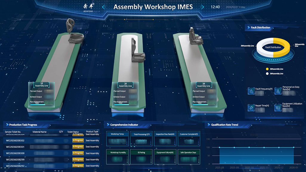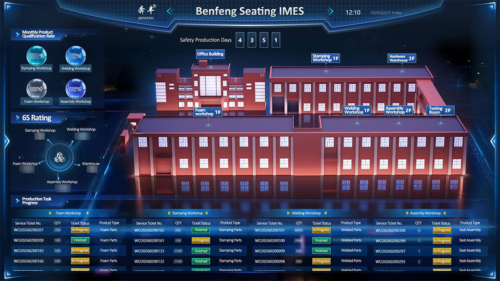 W cyfrowym ekosystemie Benfeng Seats IMES warsztat montażowy, wyposażony w inteligentne zarządzanie pełnym procesem, staje się ostatecznym poligonem testowym jakości gotowych siedzeń.