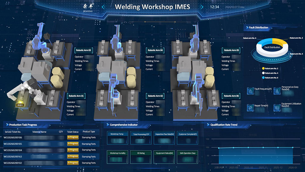 Dzięki technologii wizualizacji 3D warsztat wyraźnie przedstawia współpracę wielu inteligentnych ramion robotów spawalniczych. Każde ramię robota jest wyposażone w dedykowanego operatora i moduł monitorowania parametrów (napięcie, prąd, liczba zgrzewów itp.), co pozwala uzyskać precyzyjny i kontrolowany proces spawania. Jednocześnie monitoruje w czasie rzeczywistym kluczowe wskaźniki, takie jak temperatura, wilgotność i liczba operacji spawalniczych dziennie, zapewniając jakość spawania we wszystkich wymiarach, od środowiska po proces.